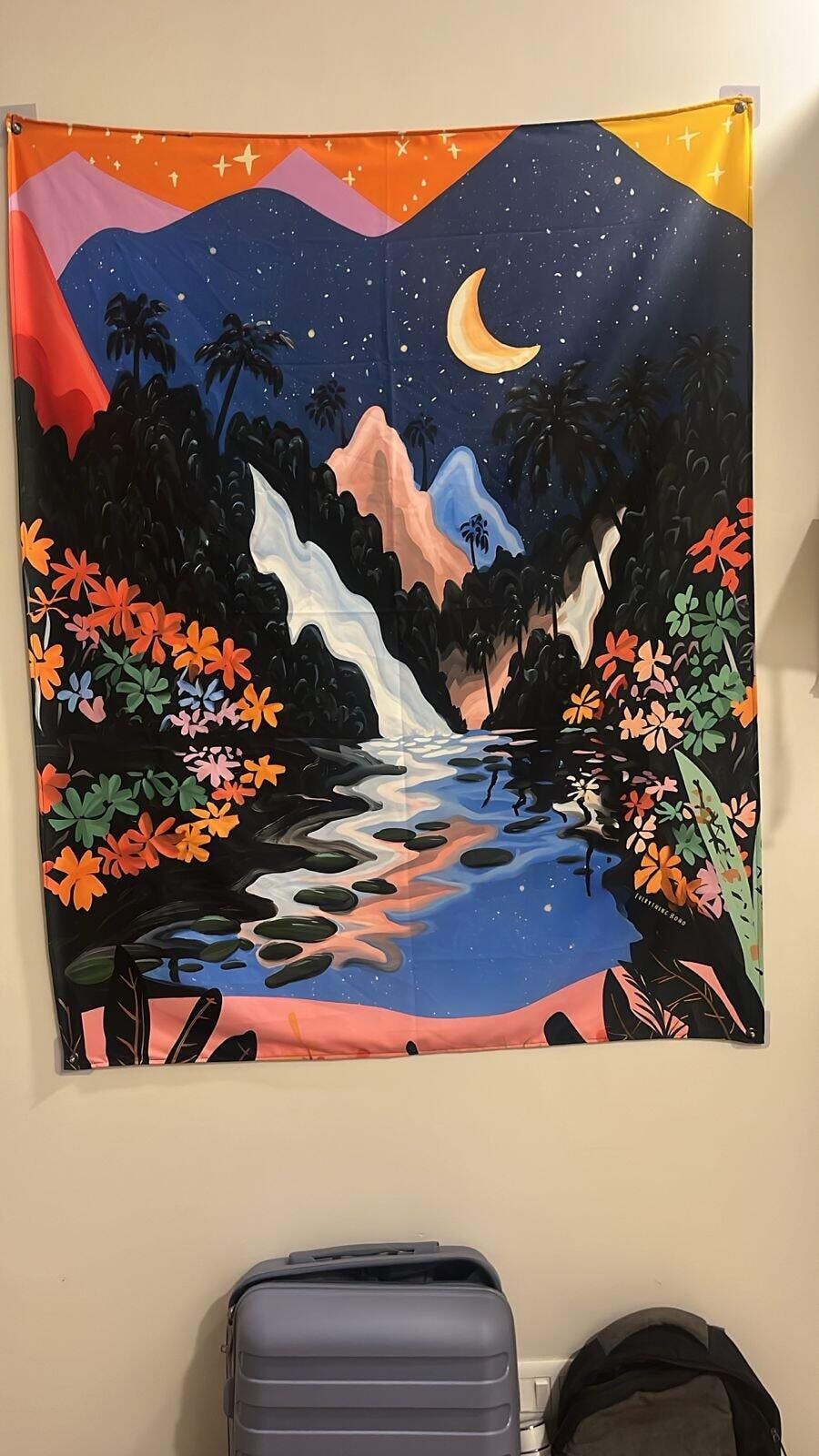 Each piece is printed in India on soft fabric and works as cloth wall hanging decor or a bohemian tapestry wall hanging – one of the easiest tapestries to hang on wall spaces where you can’t paint or drill much.